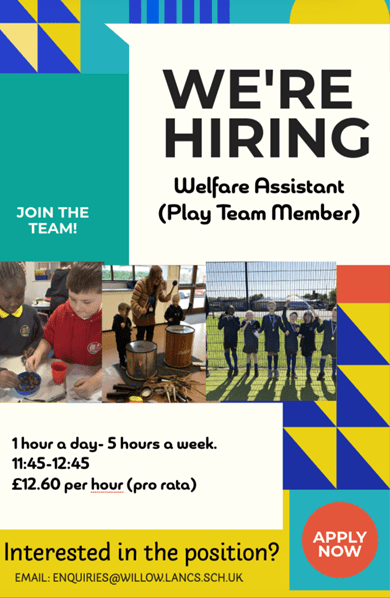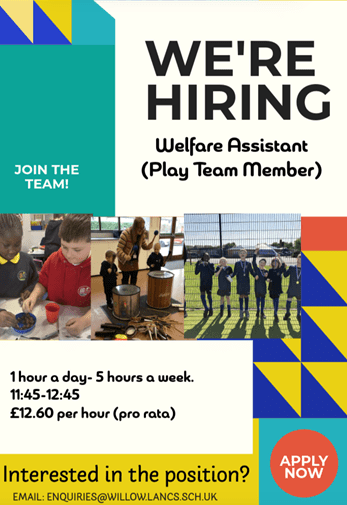 We are looking for a Welfare Assistant to start our brilliant Play team as soon as possible. Email: enquiries@willow.lancs.sch.uk for an application form